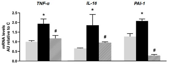 mRNA relative expression of TNF-α, IL-1β, and PAI-1 measured by RT- qPCR in pancreatic islets isolated from C (grey bars), F (black bars), and I (lined bars) rats. β-actin was used as internal standard. Values were expressed in arbitrary units (AUs) with respect to mRNA level determined in C group. Bars represent means ± SEM from three independent experiments. * p < 0.05 vs. C; # p < 0.05 vs. F. n = 6 rats/group.