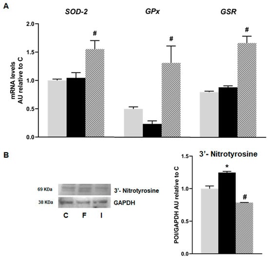 Gene expression of SOD-2, GPx, and GSR evaluated in pancreatic islets isolated from C (grey bars), F (black bars), and I (lined bars) rats. (A) mRNA relative expression measured by RT qPCR. β-actin was used as internal standard. Values were expressed in arbitrary units (AUs) with respect to mRNA level measured in C group. Bars represent means ± SEM from three independent experiments. (B) Protein levels of 3’- Nitrotyrosine determined by Western blot. Data are shown as means ± SEM in arbitrary units (AU) as the ratio between the protein of interest (POI) and GAPDH band intensity. * p < 0.05 vs. C; # p < 0.05 vs. F. n = 6 rats/group.