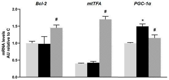 mRNA relative expression of Bcl-2, mtTFA, and PGC-1α, measured by RT- qPCR in pancreatic islets isolated from C (grey bars), F (black bars), and I (lined bars) rats. β-actin was used as internal standard. Values were expressed in arbitrary units (AUs) with respect to mRNA level determined in C group. Bars represent means ± SEM from three independent experiments. * p < 0.05 vs. C; # p < 0.05 vs. F. n = 6 rats/group.