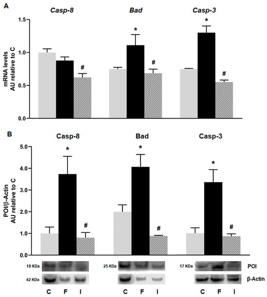 Gene expression of Caspase-8 (Casp-8), Bad, and Caspase-3 (Casp-3) evaluated in pancreatic islets isolated from C (grey bars), F (black bars), and I (lined bars) rats. (A) mRNA relative expression measured by RT qPCR. β-actin was used as housekeeping gene. Values were expressed in arbitrary units (AUs) with respect to mRNA level determined in C group. Data are shown as means ± SEM from three independent experiments. (B) Protein levels determined by Western blot in islet homogenates from all experimental groups. Representative blot is shown in each case. Bars represent means ± SEM expressed in arbitrary units (AUs) as ratio between protein of interest (POI) and β-actin band intensity. * p < 0.05 vs. C; # p < 0.05 vs. F. n = 6 rats/group.