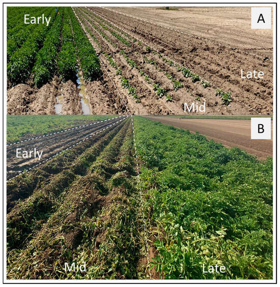 Effect of staggered planting (see Table 1 for planting dates) on sprout emergence, and crop growth and development. The experiment was laid out in a split-plot completely randomized block design with cvs. Russet Norkotah and Shepody (not distinguishable in the picture due to infield plot randomization). The 2022 developmental stages of early, mid-, and late plantings at 54, 33, and 11 DAP, respectively, are presented in (A). In contrast to mid- and late plantings, the early plantings developed a significant vine growth, and in combination with cooler spring weather of 2022, contributed to cooler soil temperatures, coinciding with tuberization. Photo (B) shows the crop as in (A) at 141 (early), 120 (mid), and 98 (late) DAP. (Note: Photo (B), 7 days after tuber harvest for the early planting, the day vines were mechanically removed for the mid-planting, and the actively growing vines for the late planting).