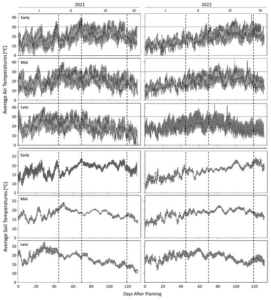 Soil and air temperature: soil and air temperatures were recorded every 15 min during the entire cropping season during the years 2021 and 2022. Soil temperature was measured at a depth of 20 cm using one of the following: ECH20 EC-5 soil moisture and temperature sensors (2021; METER Group Inc., Pullman, WA, USA), or RT-1 soil temperature sensors (2022; METER Group Inc., Pullman, WA, USA). The air temperature was measured (at approximately 1 m above ground) with a ZL6 Advanced Cloud Data Logger (2021; METER Group Inc., Pullman, WA, USA) or an ATMOS 14 temperature and humidity sensors (2022; METER Group Inc., Pullman, WA, USA). Daily average, maximum, and minimum temperatures were determined from the average of two independent field readings, one at both ends of the field test rows, for each 15 min interval reading (n = 192/day).