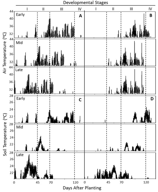 Air and soil temperatures during a 134 day cropping period (April–October) of 2021 (A,C) and 2022 (B,D) at Othello, WA. Note the differential exposure of developmental stages (I, II, III, and IV representing emergence, tuberization, bulking, and tuber maturity, respectively) to air and soil temperatures due to staggered planting. Temperatures were monitored daily in duplicate every 15 min for the entire cropping period. Air temperatures above 30 °C and soil temperatures above 20 °C (threshold for tuberization/bulking) are presented. The growing season of 2021 experienced temperatures as high as 45.5 °C (heat dome) that coincided with tuberization (stage II) of early and mid-plantings.