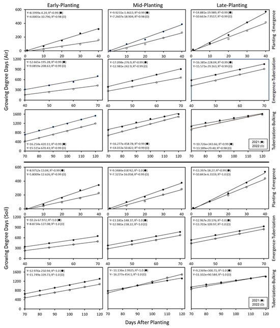 Total number of growing degree days (GDD) during the growth stages of early, mid-, and late plantings (● 2021, ○ 2022). Air and soil temperatures monitored daily every 15 min (in duplicate), and the daily averages were converted to GDDs (see materials and methods). The sum of GDDs derived from air and soil temperatures are presented. GDDs computed individually on air and soil temperatures showed similar trends. At 120 days after planting, the vines were killed, and tubers harvested after 14 days of skin-set. The GDDs increased linearly with the advancing growing period. During 2021, the number GDDs were higher, and rate of increase surpassed that of 2022, irrespective of planting time.