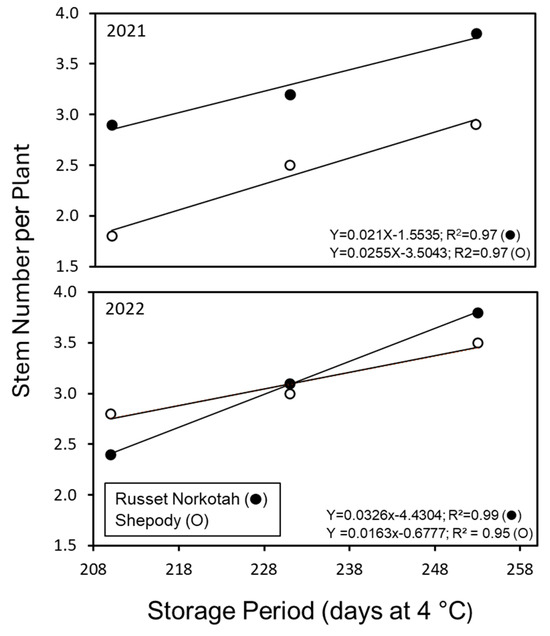 The effect of storage period and planting time the average number of stems per plant (● Russet Norkotah, ○ Shepody). The chronological ages of tubers at planting were 210 (early planting), 231 (mid-planting) and 253 (late planting) days at a constant temperature (4 °C). The stems were counted 60 days after planting. Stem numbers were positively correlated with advancing storage period irrespective of the cultivar or growing year (2021/2022).