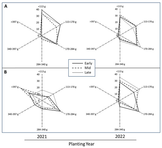 Polygonal diagrams showing the effects of planting time (see Table 1) on the contribution of size categories to the total tuber yield (percent). Each axis represents a specified tuber weight class. The shape of the polygon depicts the effect of planting time on tuber size distribution. Note the differential response of Russet Norkotah (A) and Shepody (B) and the effect of growing season (2021 vs. 2022) on tuber size profile. In contrast to Shepody, tuber size distributions were less affected by seasonal variation in temperature in Russet Norkotah. The higher temperatures during 2021 increased the proportion of larger tubers (>397 g) specifically in Shepody. Statistical significance of planting time and cultivar on total yield and the contribution of tuber size categories are presented in Table 4, Table 5 and Table 6.