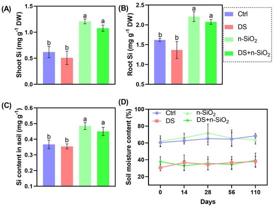 Silicon content in soybean shoots (A), roots (B), and soil (C) under control (Ctrl), drought stress (DS), n-SiO2, and combined DS + n-SiO2 treatments after the full life cycle. (D) Soil moisture content over time across treatments. n-SiO2 significantly increased Si content in shoots, roots, and soil under both normal and drought conditions while also enhancing soil moisture retention in n-SiO2-treated groups. Different letters indicate significant differences (p < 0.05) among treatments.