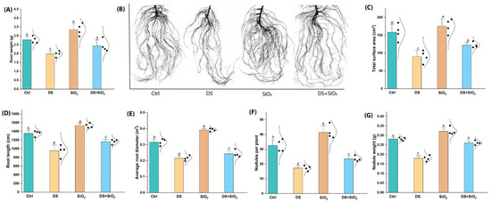 Impact of n-SiO2 on soybean root and nodule traits under normal and drought-stressed conditions after the full life cycle. (A) Root weight, (B) root morphology, (C) total root surface area, (D) root length, (E) average root diameter, (F) nodules per plant, and (G) nodule weight. Values are expressed as means ± SE, and different letters indicate statistically significant differences among treatments (p < 0.05).