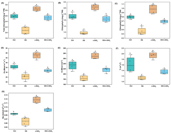 Effects of n-SiO2 treatment on soybean root and nodule traits under optimal and drought-stressed (DS) conditions were measured at 28 days. Box plots represent (A) total chlorophyll content, (B) chlorophyll a content, (C) chlorophyll b content, (D) net photosynthesis rate (Pn), (E) intercellular CO2 concentration (Ci), (F) transpiration rate (Tr), and (G) stomatal conductance (Gs). Different letters above the bars indicate significant differences (p < 0.05) among treatments. Ctrl: Control, DS: Drought Stress, n-SiO2: Nano-Silicon Dioxide, DS + n-SiO2: Drought Stress with Nano-Silicon Dioxide application. The box plots show the median (horizontal line inside the box), the interquartile range (IQR), and whiskers representing the range of data within 1.5 times the IQR. Data points outside this range are considered outliers and are marked with individual dots. Each plot is based on three replicates per treatment, and statistical comparisons were made between the groups.