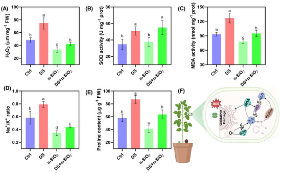 Biochemical responses of soybean under control (Ctrl), drought stress (DS), n-SiO2, and combined DS + n-SiO2 treatments after 30 days of the experiment. (A) Hydrogen peroxide (H2O2) content, showing a significant increase under DS, which is mitigated by n-SiO2 application. (B) Superoxide dismutase (SOD), (C) malondialdehyde (MDA) levels, (D) Na+/K+ ratio, (E) proline content, and (F) schematic representation illustrating the role of n-SiO2 in alleviating DS. Different letters indicate significant differences (p < 0.05) among treatments.