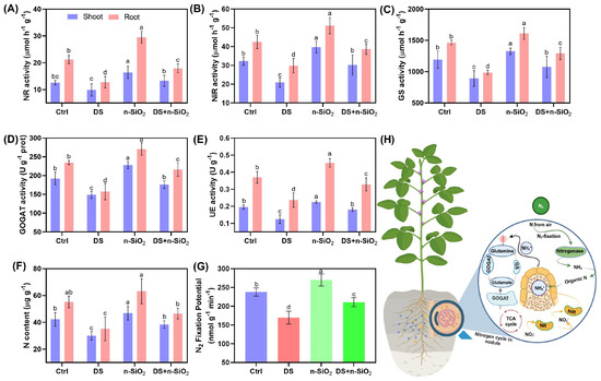 Nitrogen fixation responses in soybean under control (Ctrl), drought stress (DS), n-SiO2, and combined DS + n-SiO2 treatments after 30 days of the experiment. (A) Nitrate reductase (NR) activity in roots and shoots, (B) nitrite reductase (NiR) activity, (C) glutamine synthetase (GS) activity, (D) glutamate synthase (GOGAT) activity, (E) urease (UE) activity, and (F) nitrogen (N) content in plant tissues, (G) N2 fixation potential, and (H) schematic of nitrogen cycle processes within the soybean root nodule, depicting the contributions of n-SiO2 to maintain nitrogen metabolism under drought stress. Different letters indicate significant differences (p < 0.05) among treatments.