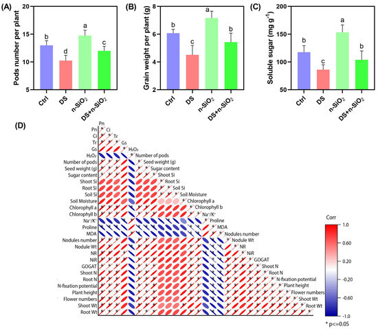 Effects of n-SiO2 on soybean yield parameters under control (Ctrl), drought stress (DS), n-SiO2, and DS + n-SiO2 treatments after a full life cycle. (A) Pod number per plant, (B) grain weight per plant, and (C) soluble sugar content. (D) Correlation matrix showing relationships among agronomic, physiological, and biochemical traits, highlighting positive correlations between yield components and photosynthetic and nitrogen metabolism parameters. Different letters indicate significant differences (p < 0.05) among treatments.