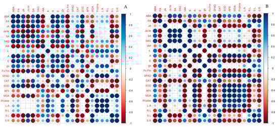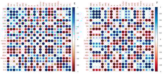 Overall, it was observed in Furr that all hormones were positively correlated with each other. Water xylem potential was negatively correlated with ABA (−0.80), PA (−0.90), JA (−0.99), Jalle (−0.65), SA (−0.66), SAG (−0.26) and IAA (−0.80). All hormones were negatively correlated with SOD and APX. ABA, SA and IAA exhibited a large negative correlation with proline and leaf area. Transpiration was negatively correlated with water xylem potential (−1.00), fluorescence (−0.99), SOD (−0.99) and APX (−0.99). MDA had a positive relation with PA (0.89), Jalle (0.99), SAG (0.93) and SPAD (0.94).