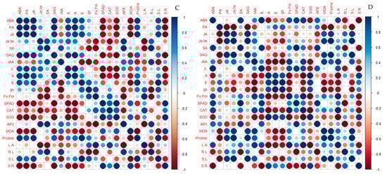 Correlation coefficients of morphological, physiological, chemical and hormone parameters are shown in Figure 7. In Carrizo citrange, the ABA value was positively correlated with PA (0.99), SA (0.87) and SAG (0.99), while it presented a negative correlation with IAA (−0.98) and Jalle (−0.92). PA exhibited a positive relationship with SA (0.83) while PA, JA, SA and SAG were negatively related with IAA (−0.99, −0.82, −0.74, −0.99, respectively) and with Jalle (−0.87, −0.99, −0.99 and −0.85). Water xylem potential was negatively related with JA (−0.50) and SA (−0.59). Net photosynthesis was positively correlated with all quantified hormones except Jalle (−0.81) and IAA (−0.99). The same trend was observed in the transpiration value, while gs exhibited a negative correlation with the IAA hormone (−0.91). It was observed that fluorescence had a high relationship only with hormones Jalle (0.95) and IAA (0.95). Catalase exhibited a high relationship with JA (0.79) and SA (0.85), while a strongly negative correlation was observed with Jalle, xylem water potential, MDA, shoot length and shoot/root ratio. SOD was negatively related with Jalle (−0.99), IAA (−0.98), Fv/Fm (−0.99), MDA (−0.86), shoot length (−0.94) and shoot/root ratio (−0.76). APX was mostly negatively related with gs, SPAD, leaf area and root length. Furthermore, MDA was positively related with Jalle, xylem water potential, Fv/Fm, shoot length and shoot/root ratio. Proline showed a strong negative correlation only with APX activity (−0.97). Furthermore, it was observed that shoot length and shoot/root ratio were negatively linked to all hormones except Jalle.