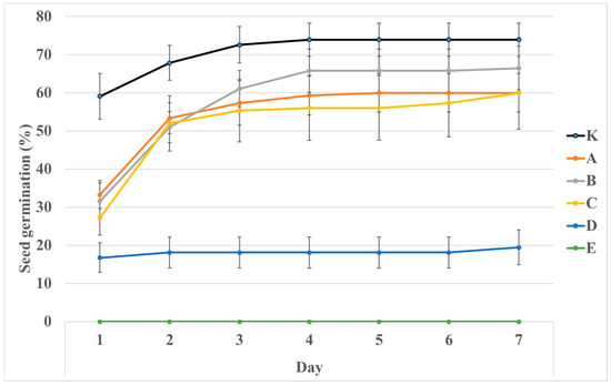 The germination data were analyzed using statistical package STATISTICA 14.0.0.15. [28]. One-way analysis of variance (ANOVA) was performed, followed by Tukey’s HSD test for multiple comparisons among treatments (categorical variable was treatment with these options K, A–E). Statistical calculations were conducted at α < 0.5.