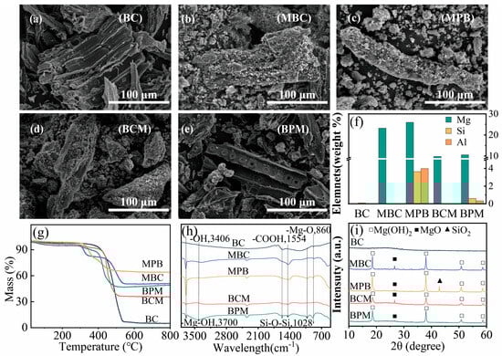 As shown in the SEM patterns in Figure 1a–e, the BC had a smooth surface with a tubular fiber structure of woody biochar. Compared with those of BC, the MBC and MPB fiber structures were fragmented with rough and porous surfaces, and MPB had a greater degree of fragmentation. Compared with the pre-modified MBC and MPB, the post-modified BCM and BPM fiber structures were less fragmented but appeared to have more micropores on the surface. The EDS mapping in Figure 1f revealed that the BC surface contained only trace amounts of Si and that the premodified MPB contained relatively high contents of Mg, Si, and Al. Thermogravimetric analysis (Figure 1g) indicated that the mass of all five biochars remained stable above 600 °C, with MPB retaining 64.02% of its original mass, demonstrating the highest thermal stability. The FT-IR spectra (Figure 1h) revealed that the four modified biochar at 864 cm−1 for the Mg-O bond [] and 1554 cm−1 for the –COOH bond were not significantly different, and no significant difference in the stretching vibration of the Si–O–Si bond was observed at 1028 cm−1 for MPB and BPM []. The strongest vibration of the sharp –Mg–OH peak was detected at 3700 cm−1 for MPB []. The XRD patterns (Figure 1i) revealed that no obvious mineral presence was detected on the BC surface, and characteristic peaks of Mg(OH)2 were detected at 18.56°, 37.94°, 50.75°, and 58.57° for the four modified biochar. MgO was detected at 42.85°, and only MPB was detected at 26.62° for SiO2.