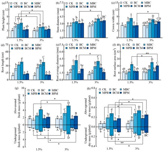 Effects of biochar on the morphology and mass of Sedum alfredii Hance. Plant height (a), stem diameter (b), crown width (c), root length (d), root surface area (e), root diameter (f), fresh mass (g), and dry mass (h) of Sedum alfredii Hance under different treatment conditions. CK indicates the control group without biochar addition. Different lowercase letters indicate that there were significant differences in the morphology of Sedum alfredii Hance plants among the different biochar treatment groups at 1.5% addition (Duncan test, p < 0.05); different capital letters indicate that there were significant differences in the morphology of Sedum alfredii Hance plants among the different biochar treatment groups at 3% addition (Duncan test, p < 0.05); and asterisks denote significant differences in the morphology of Sedum alfredii Hance plants between the treatment groups with different additions of the same biochar (independent samples t-test, * and ** represent p < 0.05 and p < 0.01, respectively); n = 3.