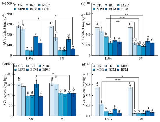 Previous studies have demonstrated that soil heavy metal contamination inhibits plant growth, resulting in reduced yields and quality of agricultural products []. Biochar application can reduce the available heavy metal content and promote plant growth [,]. Figure 3 shows the available heavy metal contents in the rhizosphere soils of the different biochar treatment groups. Compared with CK, 1.5% and 3% BC significantly reduced the ACu, APb, and ACd contents in the rhizosphere soil. Compared to BC, 1.5% MBC, MPB, BCM, and BPM significantly reduced the content of ACu, APb, and ACd by 52.7−81.5%, 22.6−46.7%, and 44.2−76.8%, respectively. In addition to BCM, the other three modified biochar significantly reduced the content of AZn by 29.4−33.3%; 3% MBC, MPB, BCM, and BPM significantly reduced the content of AZn by 27.3−30.3%. In addition to BCM, the other three modified biochar significantly reduced the content of ACu by 62.1−71.0%. Overall, the passivation effect of biochar on heavy metals followed the order of MPB > MBC > BPM > BCM > BC, and the effect of 3% biochar addition was greater than that of 1.5% biochar addition. This is consistent with the adsorption characteristics of biochar for heavy metals (Table 2). Moreover, the more significant the passivation effect of biochar on heavy metals is, the lower the available heavy metal content in the soil and the more significant the promotion effect of biochar on the growth of Sedum alfredii Hance.