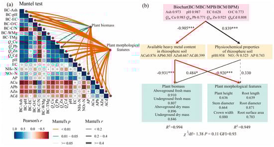 On the basis of the results of the Mantel test, the indicators with significant correlations with Sedum alfredii Hance biomass and plant morphology were selected to construct a structural equation model (Figure 4b), which yielded p = 0.11 (p > 0.05), GFI = 0.93 (GFI ≥ 0.90), and χ2/df = 1.38 (χ2/df < 2), indicating that the model was reliable []. The results revealed that the available heavy metal content in rhizosphere soil was highly significantly negatively correlated with the biochar content (p < 0.001), with a path coefficient of −0.905, indicating that the addition of biochar significantly reduced the available heavy metal content in rhizosphere soil; the mass and plant morphology of Sedum alfredii Hance was highly significantly negatively correlated with the available heavy metal content in rhizosphere soil (p < 0.001), with path coefficients of −0.931 and −0.920, respectively, which indicated that the lower available heavy metal content in rhizosphere soil was more favorable to the growth of Sedum alfredii Hance; the basic physicochemical properties of the rhizosphere soil were highly significantly positively correlated with the biochar characteristics (p < 0.001), with path coefficients of 0.839; and the addition of biochar significantly increased the pH, NO3−-N and AP of the rhizosphere soil. The mass of Sedum alfredii Hance was highly significantly negatively correlated with the physicochemical properties of rhizosphere soil, with a significant positive correlation (p < 0.05) and a path coefficient of 0.484.