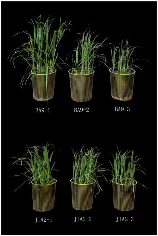 Differences in growth morphologies of two oat cultivars with different drought tolerances after being subjected to drought stress. BA9-1, BA9-2, BA9-3, JIA2-1, JIA2-2, and JIA2-3 represent the normal water supply (70%), moderate drought stress (45%), and severe drought stress (30%) conditions for BA9 and JIA 2, respectively.