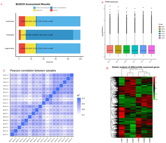Sequencing sample evaluation of transcriptomics of two oat cultivars with different drought tolerances under drought stress. Note: (A) BUSCO assessment completeness statistical chart. (B) A boxplot figure depicting FPKM under different experimental conditions. The X-axis represents different conditions, and the Y-axis is the log10 (FPKM) value of different genes. (C) A heatmap of correlation coefficient for the correlation between samples. (D) Genes that are differentially expressed in BA9 and JIA2 in response to drought stress. BA9-1, BA9-2, BA9-3, JIA2-1, JIA2-2, and JIA2-3 represent the normal water supply (70%), moderate drought stress (45%), and severe drought stress (30%) conditions for BA9 and JIA 2, respectively.