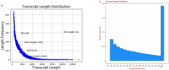 This sequencing process generated a total of 393,328 reads, with a total length of 566,345,053 bp. The longest sample was 13,283 bp, with an average length of 1440 bp (Figure 3A). Sequence length analysis of the 393,328 transcripts revealed that 76.75% (301,870) of the sequences were below 2000 bp in length. Specifically, there were 75,207 sequences under 500 bp long, 105,908 between 500 and 1000 bp long, 120,755 between 1000 and 2000 bp long, and 91,458 sequences exceeding 2000 bp in length (Figure 3B). Based on annotation results from the Nr library, species distribution maps on the comparison were statistically analyzed and plotted. The results indicated that the top species identified in the comparison were barley, wheat, Ural wheat, rice, and corn.