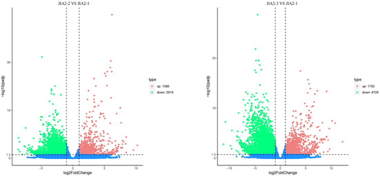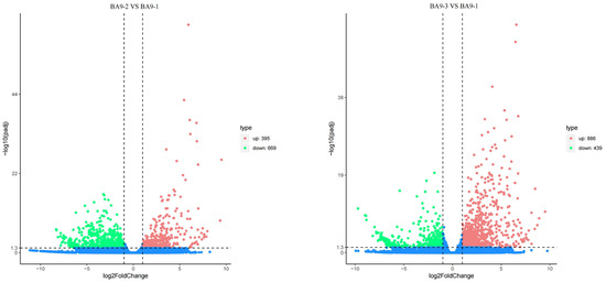 Volcano map of differentially expressed proteins of two cultivars under drought stress. Note: When FC ≥ 2.0 and p-value ≤ 0.05, we screened for upregulated-expression proteins, when FC ≤ 0.50 and p-value ≤ 0.05, we screened for downregulated-expression proteins. Note: BA9-1, BA9-2, BA9-3, JIA2-1, JIA2-2, and JIA2-3 represent the normal water supply (70%), moderate drought stress (45%), and severe drought stress (30%) conditions for BA9 and JIA 2, respectively.