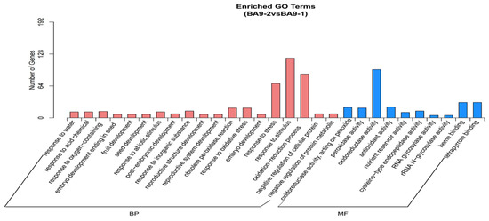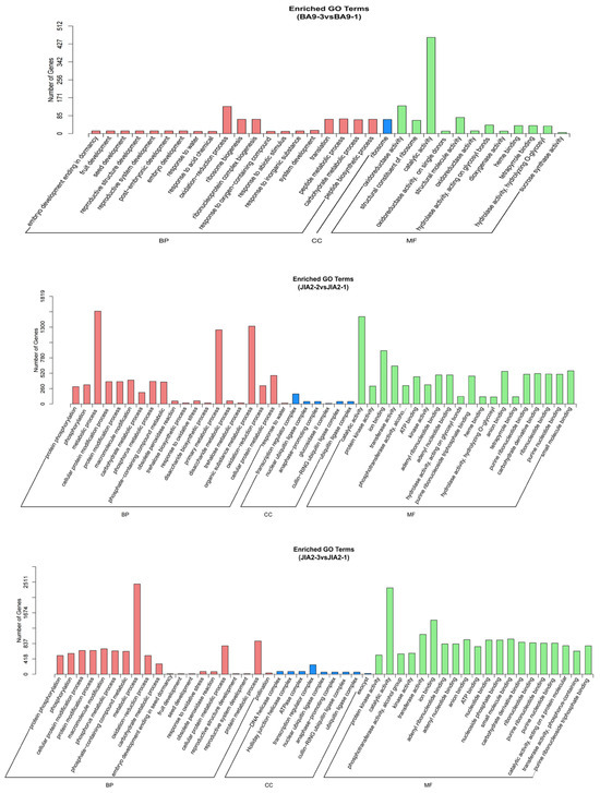 Analysis of GO enrichment of differentially expressed genes of two oat cultivars with different drought tolerances under drought stress. Note: BA9-1, BA9-2, BA9-3, JIA2-1, JIA2-2, and JIA2-3 represent the normal water supply (70%), moderate drought stress (45%), and severe drought stress (30%) conditions for BA9 and JIA 2, respectively.
