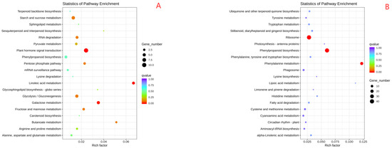 The KEGG database was used to identify the primary metabolic pathways associated with the DEGs (Figure 7). Under moderate stress, the co-upregulated genes in BA9 and JIA2 were predominantly involved in starch and sucrose metabolism (6/30, with the numbers representing the genes in the BA9 and JIA2 pathways, respectively), phenylpropane biosynthesis (4/22), galactose metabolism (5/8), carotenoid biosynthesis (1/3), and linoleic acid metabolism (4/3). The pathways uniquely upregulated in BA9 genes under moderate stress included plant hormone signal transduction (10), glycolysis (5), butyrate metabolism (2), the pentose phosphate pathway (3), fructose and mannose metabolism (3), RNA degradation (4), pyruvate metabolism (3), and arginine and proline metabolism (2). The most significant pathways uniquely upregulated in JIA2 genes under moderate stress included gene replication (12), cyanide amino acid metabolism (13), pyrimidine metabolism (10), homologous recombination (5), nitrogen metabolism (6), and purine metabolism (8). The co-downregulated genes in BA9 and JIA2 under moderate stress were mainly associated with phenylpropane biosynthesis (39/95, with the numbers representing the genes in BA9 and JIA2, respectively); phenylalanine metabolism (17/29); biosynthesis of phenylalanine, tyrosine, and tryptophan (3/7); and cyanide amino acid metabolism (4/20). The most significant pathways uniquely downregulated in BA9 genes under moderate stress included the ribosome pathway (41), whereas, in JIA2, they involved starch and sucrose metabolism (50), plant–pathogen interactions (47), linoleic acid metabolism (10), plant hormone signal transduction (30), galactose metabolism (13), and flavonoid biosynthesis (11).
