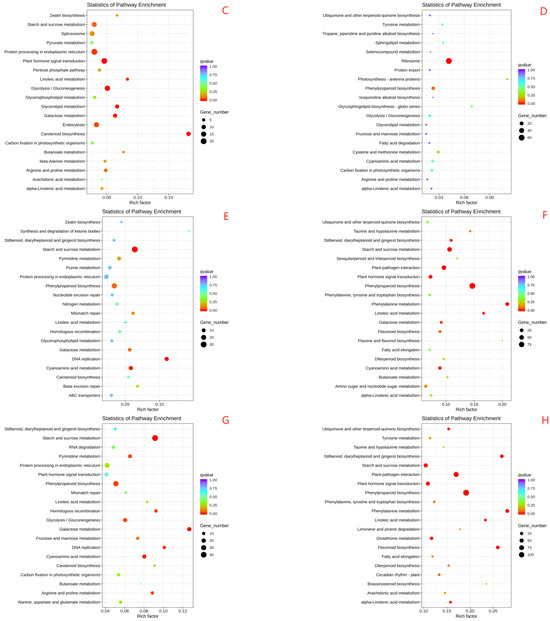 Analysis of KEGG enrichment of differentially expressed genes of two oat cultivars with different drought tolerances under drought stress. Note: (A) represents BA9-2 treatment upregulated genes; (B) represents BA9-2 treatment downregulated genes; (C) represents BA9-3 treatment upregulated genes; (D) represents BA9-3 treatment downregulated genes; (E) represents JIA2-2 treatment upregulated genes; (F) represents JIA2-2 treatment downregulated genes; (G) represents JIA2-3 treatment upregulated genes; (H) represents JIA2-3 treatment downregulated genes.
