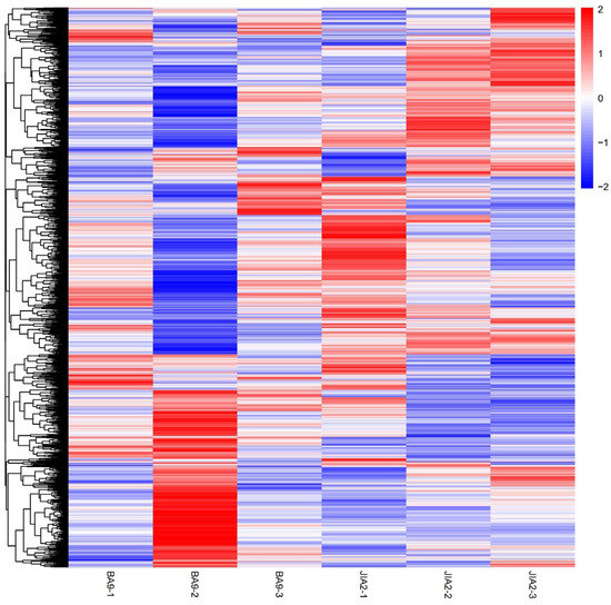 Cluster map of differentially expressed proteins of two cultivars under drought stress. Note: BA9-1, BA9-2, BA9-3, JIA2-1, JIA2-2, and JIA2-3 represent the normal water supply (70%), moderate drought stress (45%), and severe drought stress (30%) conditions for BA9 and JIA 2, respectively.