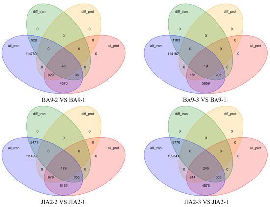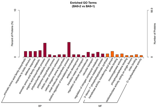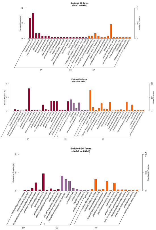 As depicted in Figure 9, under moderate stress, BA9 exhibited 590 upregulated and 397 downregulated DEPs, while under severe stress, BA9 exhibited 126 upregulated and 75 downregulated proteins. Under moderate stress, JIA2 exhibited 489 upregulated and 394 downregulated DEPs, while under severe stress, JIA2 exhibited 493 upregulated and 701 downregulated proteins. Significant differences were observed in the number of upregulated and downregulated proteins between BA9 and JIA2 under severe stress (Figure 10).