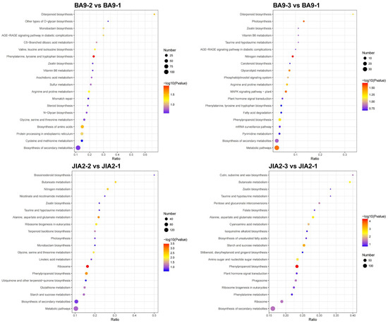 The metabolic pathways involved in the co-upregulation of BA9 and JIA2 genes under severe stress were mainly concentrated in carotenoid biosynthesis (10/5, with the numbers representing genes in BA9 and JIA2, respectively), plant hormone signal transduction (19/17), glycolysis (16/19), galactose metabolism (9/18), protein processing in the endoplasmic reticulum (20/28), linoleic acid metabolism (5/5), starch and sucrose metabolism (14/43), arginine and proline metabolism (6/11), butyrate metabolism (3/3), carbon fixation in photosynthetic organisms (5/10), and pyruvate metabolism (5/16). The most significant pathways uniquely upregulated in BA9 genes under severe stress included lipid metabolism (9), endocytosis (14), the spliceosome (13), pentose phosphate pathway (5), and β-alanine metabolism (4). In contrast, the pathways uniquely upregulated in JIA2 genes under severe stress included cyanide amino acid metabolism (18); DNA replication (11); homologous recombination (11); phenylpropane biosynthesis (33); fructose and mannose metabolism (10); alanine, aspartate, and glutamate metabolism (10); and RNA degradation (12). The metabolic pathways involved in the co-downregulation of BA9 and JIA2 genes under severe stress were mainly concentrated in phenylpropanoid biosynthesis (15/124), ubiquinone and other-terpenoid-quinone biosynthesis (2/16), alpha-linolenic acid metabolism (2/15), and tyrosine metabolism (3/10). The most significant pathways uniquely downregulated in BA9 genes under severe stress included the ribosome pathway (61) and the metabolism of cysteine and methionine (7). In contrast, pathways uniquely downregulated in JIA2 genes involved plant–pathogen interaction (83), phenylalanine metabolism (39), flavonoid biosynthesis (32), linoleic acid metabolism (14), plant hormone signal transduction (45), starch and sucrose metabolism (49), glutathione metabolism (29), circadian rhythm in plants (12), and biosynthesis of phenylalanine, tyrosine, and tryptophan (12).