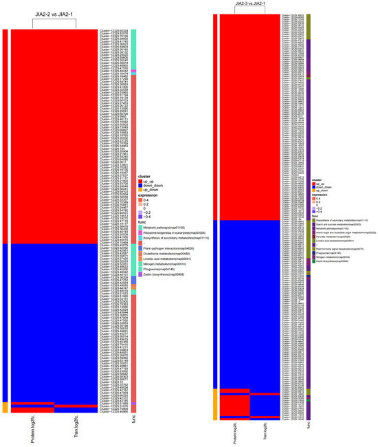Compared with no drought stress, under moderate stress, JIA2 exhibited 80 matched upregulated DEGs and DEPs, primarily associated with metabolic pathways, including Cluster-12329.52078 (peroxidase 7), Cluster-12329.10917 (V-type proton ATPase subunit), Cluster-12329.27420 (peroxidase P7), Cluster-12329.59603 (NADP-dependent malate enzyme), Cluster-12329.41740 (1,4-alpha-glucan branching enzyme 2), Cluster-12329.45206 (potential alpha trehalose phosphate synthase), Cluster-12329.36823 (blunt leaf alcohol 14-α-demethylase), Cluster-12329.35358 (3-phosphoglycerol 2-O-acyltransferase 6), and Cluster-12329.43587 (fructan exonuclease). Additional pathways included biosynthesis of secondary metabolites (Cluster-12329.16474: NAD(P)H dehydrogenase FQR1) and ribosome biogenesis in eukaryotes (Cluster-12329.48442). Furthermore, 59 matched DEGs and DEPs were downregulated, mainly involving metabolic pathways such as glutathione metabolism (Cluster-12329.49095: protein IN2-1), plant–pathogen interactions (Cluster-12329.47252: calcium-dependent protein kinase 13; Cluster-12329.42554: Predictive protein), linoleic acid metabolism (Cluster-12329.44747: lipoxygenase), nitrogen metabolism (Cluster-12329.48919), and the phagosome (Cluster-12329.51553). Additionally, a few matched DEGs displayed protein expression trends in the opposite direction (Figure 15).