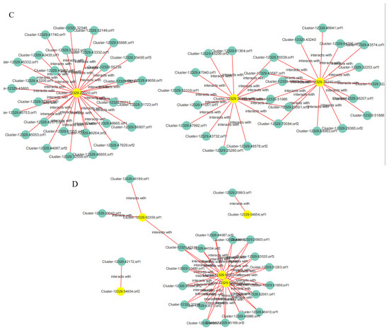 (3) Cluster-12329.29020, Orf1 (sucrose synthase 4), plays a key role and is associated with Cluster-12329.42345, Orf1 (serine/threonine protein kinase SAPK8 isoform X1), Cluster-12329.46332; Orf1 (serine/threonine protein kinase STY13), Cluster-12329.45053; Orf1 (UDP pyrophosphate synthase), Cluster-12329.68807; Orf1 (starch synthase 1), and Cluster-12329.32559; Orf1 (α-glucosidase), among 39 proteins. These are primarily associated with protein kinase activity, carbohydrate transport and metabolism, and starch and sucrose metabolism. Cluster-12329.35240; Orf1 (β-glucosidase) is associated with Cluster-12329.43809; Orf2 (aminopeptidase M1-B), Cluster-12329.43240, Cluster-12329.32231; Orf1 (aldose 1-isomerase), Cluster-12329.68563; Orf1, Cluster-12329.36207; Orf1 (anthocyanin 3-O-glucosyltransferase), Cluster-12329.32253; Orf1 (Xet2 protein), numbering among 16 proteins. These are mainly involved in protein hydrolysis, heat shock proteins, glycolysis, carbohydrate transport and metabolism, flavonoid glycosyltransferases, and xylose glycosyltransferases. Cluster-12329.36165; Orf1 (1-phosphate glucosyltransferase) is associated with Cluster-12329.25280; Orf1, Cluster-12329.48578; Orf2 (glycerol kinase), Cluster-12329.43732; Orf1 (6-phosphogluconate lactonase), Cluster-12329.41051; Orf1 (cinnamoyl CoA reductase), Cluster-12329.47992; Orf1 (trehalose-6-phosphate synthase 6), among 16 proteins. The functions are primarily associated with oxidoreductase activity, energy production and conversion, carbohydrate metabolism, catalytic activity, and the trehalose biosynthesis process.