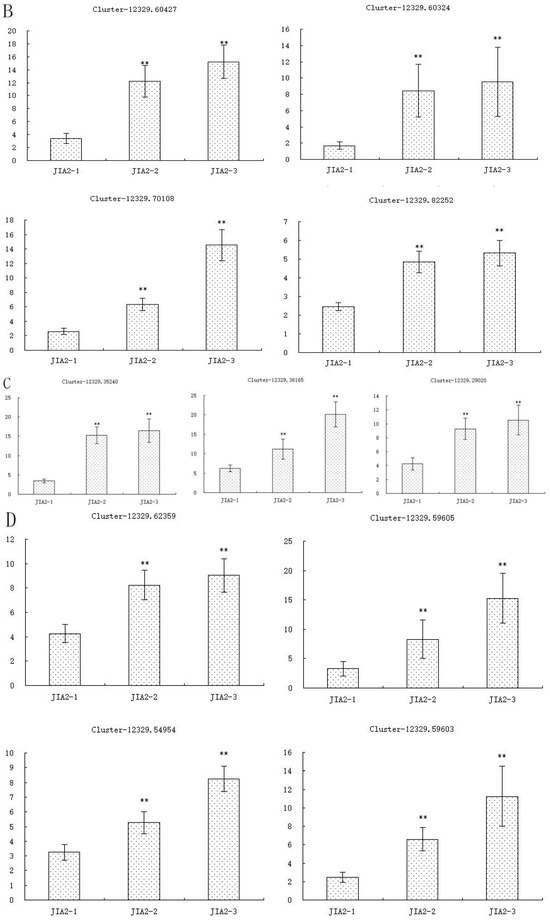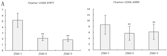 Under moderate stress, JIA2′s differentially expressed transcription factors were classified into 10 categories, including 2 in MYB, 2 in WRKY, 1 in AP2, 1 in GATA, and 1 in HSF (Figure 4A). Under severe stress, JIA2′s differentially expressed transcription factors were classified into 12 categories, including 3 in WRKY, 2 in MYB, 2 in HSF, 2 in bHLH, and 1 in GATA (Figure 4B).