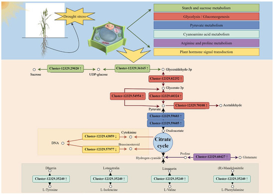 Schematic diagram of key metabolism response proteins and genes of drought-tolerant cultivar JIA2 in response to drought stress. Note: The colors of the genes at the bottom of the figure correspond to the metabolic pathways of the same color at the top (this figure was created using Figdraw).