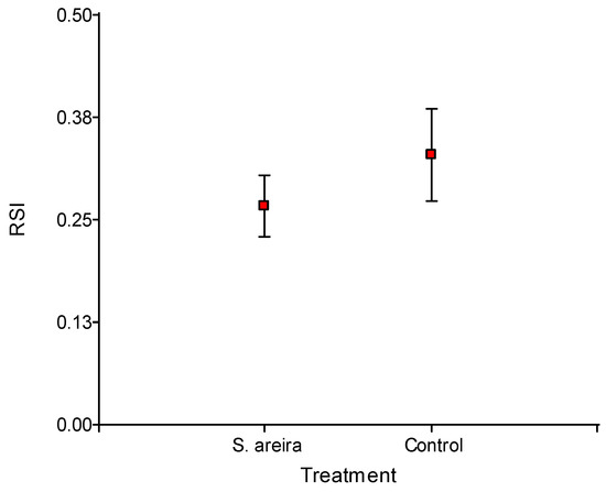 The exposure to the EO volatiles had no effect on the mating success of tsl sterile males, as shown by the comparison of the relative sterility index (RSI) values between exposed and non-exposed males (Figure 1; GLM: F = 2.89 p = 0.1083). The tsl males exposed to S. areira EO had the same performance as control males (non-exposed tsl males).