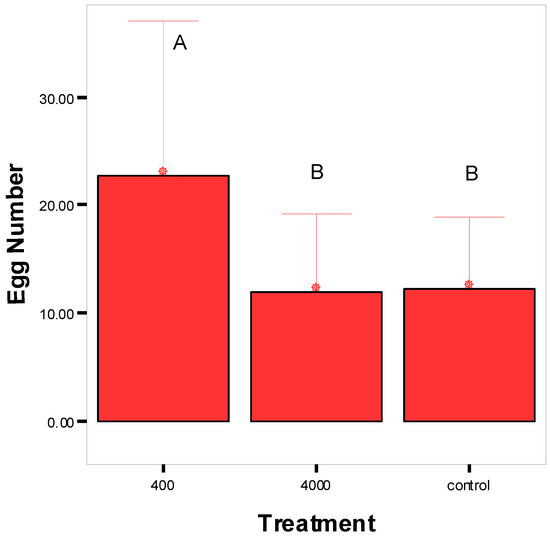 The infestation percentage observed on grapes superficially treated with 0 (control), 400, and 4000 ppm concentrations of S. areira EO was 55%, 80%, and 65%, respectively. Significant differences were observed in the number of eggs laid by females among the treatments (F = 45.5; d.f. = 2; p = 0.0001). Females laid more eggs on grapes treated with a low concentration of the S. areira EO (Figure 2).