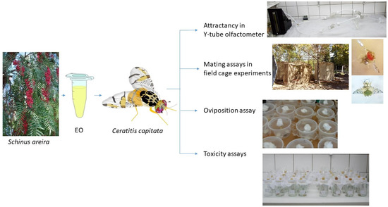 Based on the above, the aim of the present study was to analyze and test the bioactivity of the EO of S. areira on C. capitata adults through laboratory and semi-field assays. Our specific aim was to evaluate its attraction and toxicity to adults, its potential as a sexual enhancer for sterile males in the SIT, and its oviposition-deterrent effect on females.