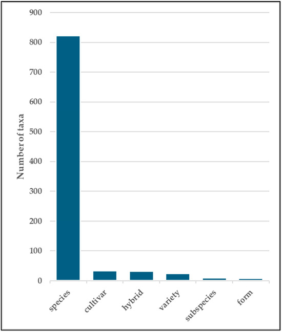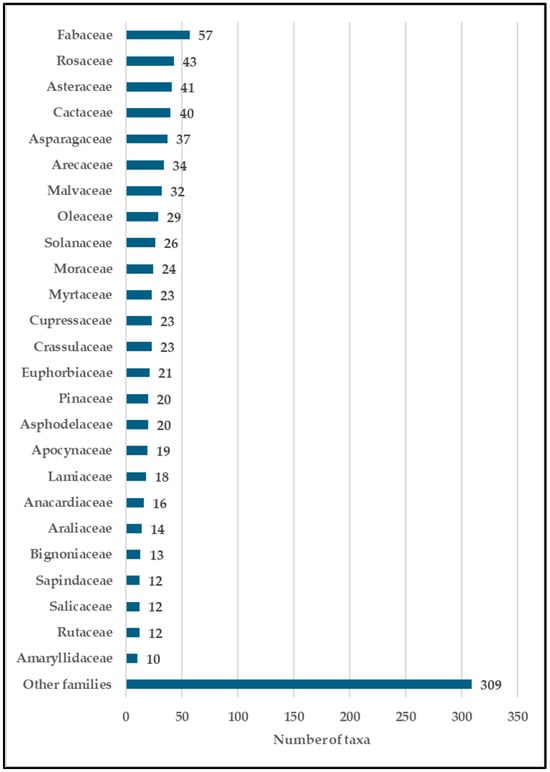 A total of 928 taxa, including 823 species s. str., 33 cultivar, 31 hybrids, 24 varieties, 9 subspecies, and 8 forms, are listed (Figure 1). The recorded taxa belong to 486 genera of 138 families (Table S1). A total of 8 taxa belong to the Pteridophyta, 61 to the Pinophyta, 5 to the Cycadophyta, 1 to the Ginkgophyta, and 853 to the Magnoliophyta (693 Magnoliopsida and 160 Liliopsida). The families with the highest number of specific and subspecific taxa are the following: Fabaceae (57 taxa, 6.1%), Rosaceae (43 taxa, 4.6%), Asteraceae (41 taxa, 4.4%), Cactaceae (40 taxa, 4.3%), Asparagaceae (37 taxa, 4.0%), Arecaceae (34 taxa, 3.7%), Malvaceae (32 taxa, 3.4%), Oleaceae (29 taxa, 3.1%), Solanaceae (26 taxa, 2.8%), Moraceae (24, taxa, 2.6%), Cupressaceae, Crassulaceae, and Myrtaceae (23 taxa, 2.5%), Euphorbiaceae (21 taxa, 2.3%), Pinaceae, and Asphodelaceae (20 taxa, 2.2%) (Figure 2).