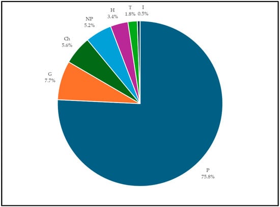 A growth form spectrum of ornamental taxa categorized according to [12,13] (P, Phanerophytes; NP, Nanophanerophytes; Ch, Chamaephytes; H, Hemicryptophytes; G, Geophytes; T, Therophytes; and I, Idrophytes).