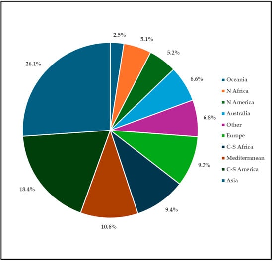 The above percentage breakdown is due to the fact that trees, shrubs, and geophytes demand less cultivation care than other types of plants. Annuals, specifically, thrive primarily in private gardens, where the owners’ care and commitment are more significant. Likewise, aquatic plants are rarely seen, primarily because of the limited water resources and the high costs associated with their maintenance [3]. Regarding the geographical origin (Figure 4), the contingents with the greatest number of representatives are the Asian (26.1%), the American (5.2% North, and 18.4% Central and South America), and the African (14.5% of which 9.4% are from Southern Africa).