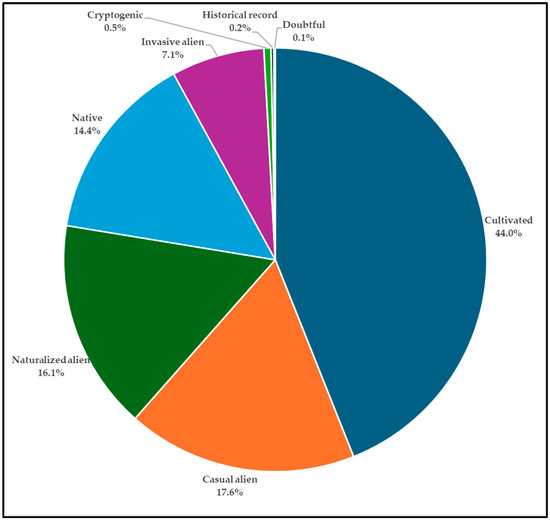 The Mediterranean contingent amounts to 10.6%, demonstrating a certain interest also in the use of native plants for decorative purposes. The flora of the European continent accounts to 9.3% and that of Oceania to 9.1% (mainly from Australia, 6.6%). Finally, 6.8% is represented by taxa of different origins: Pacific Islands, Atlantic Islands (Canary Islands, Azores), horticultural, and artificial hybrids. The most represented origin biome is the temperate (321 taxa, 34.6%); however, adding the data of the subtropical and tropical biomes (in total 536 taxa, 57.7%), most of the taxa come from warm climates. Only 134 taxa (14.0%) are native to Italy, while 786 taxa (85.0%) are allochthonous; the remaining eight taxa (1.0%) are included in the cryptogenic, historical record, and doubtful categories. Concerning the tendency of naturalization on the allochthonous taxa, 408 taxa (44.0%) are cultivated, 163 taxa (18.0%) are casual alien (i.e., they exhibit a trend towards naturalization yet do not form populations separate from the cultivated plants), 149 taxa (16.0%) are naturalized (i.e., they tend to form stable populations) and 66 taxa (7.0%) are invasive alien (i.e., they could pose a threat to biodiversity by competing with native species) (Figure 5).
