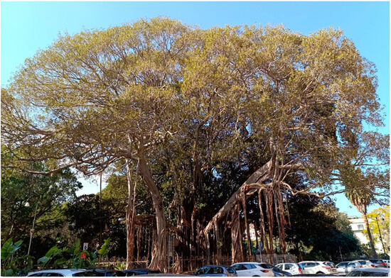 Since the Sicilian territory includes a wide range of bioclimatic areas [9], the island can host taxa originating from different climates. Indeed, in the mountainous or hilly areas (Madonie, Nebrodi, province of Enna, Etna volcano, Iblean Plateau, and Mounts Sicani) there are typical taxa from cooler climates such as Abies alba Mill., A. cephalonica Loudon, A. nebrodensis (Lojac.) Mattei, A. pinsapo Boiss., Amelanchier laevis Wiegand, Cedrus atlantica (Endl.) Manetti ex Carrière, Cedrus deodara (Roxb. ex D. Don) G. Don, C. libani A. Rich., Picea abies (L.) H. Karst., P. pungens Engelm., P. smithiana (Willd.) Boiss., Sequoia sempervirens (D. Don) Endl., and Taxus baccata L.. As for Abies nebrodensis, it is an endemic species with limited distribution on the Madonie Mountains and at risk of extinction. Among the ex situ conservation actions proposed within LIFE projects (LIFE Natura and LIFE4FIR) the adoption of plants by local populations has been foreseen. This proposal, which was favorably received, has led to the widespread use of A. nebrodensis as an ornamental plant in recent times. Along the coasts of Sicily, where the climate is warmer, taxa of the subtropical and tropical flora prevail. This is certainly the floristic component that peculiarly characterizes the Sicilian ornamental flora. In fact, these taxa, planted in open air, manage to flower and bear fruit abundantly, arousing the wonder of foreigners visiting the island. Furthermore, several of these taxa, which in Sicily grow vigorously and luxuriantly, in the rest of Italy and Europe either do not survive or live with difficulty and rarely bloom. Under these conditions, lush gardens and magnificent villas arose in the coastal Sicilian cities, of such splendor and richness as to evoke an almost phantasmagorical impression of the tropics in the heart of the Mediterranean. In this sense, there are several taxa of high ornamental value, not only for the beauty of the flowering but also for the vegetative habitus, which now characterize the Sicilian coastal urban greenery. The survey of the Sicilian ornamental heritage revealed the presence of rare taxa both for the Sicilian context and for the Italian and Mediterranean one. Some of them are also relevant for their size, age, historical value, the role they play in the characterization of individual plants, and of relative contexts. These taxa, therefore, constitute real floristic and cultural peculiarities. The most significant ones are reported below as follows: Acokanthera oppositifolia (Lam.) Codd, Agathis robusta (C. Moore ex F. Muell.) F. M.Bailey, Allocasuarina verticillata (Lam.) L. A. S.Johnson, Aloidendron barberae (Dyer) Klopper and Gideon F. Sm., Alpinia zerumbet (Pers.) B. L. Burtt and R. M. Sm., Araucaria araucana (Molina) K. Koch, A. bidwillii Hook., A. cunninghamii Mudie, A. rulei F. Muell., Bosea yervamora L., Brahea calcarea Liebm., B. dulcis (Kunth) Mart., Butia yatay (Mart.) Becc., Calycanthus floridus L., Camphora officinarum Boerh. ex Fabr., Ceratozamia mexicana Brongn., Combretum indicum (L.) De Filipps, Cordia francisci Ten., C. myxa L., Corynocarpus laevigatus J. R. Forst. and G. Forst., Decaisnea fargesii Franch., Delonix regia (Bojer) Raf., Dracaena draco L., Ehretia tinifolia L., Elaeodendron australe Vent., Enterolobium contortisiliquum (Vell.) Morong, Eriocephalus africanus L., Erythrina afra Thunb., Eucalyptus grandis W. Hill ex Maiden, Euphorbia candelabrum Welw., E. tirucalli L., E. triangularis Desf. ex A. Berger, Ficus altissima Blume, F. benghalensis L., F. benjamina L., F. elastica Roxb. ex Hornem var. decora Guillaumin, F. lyrata Warb., F. macrophylla Pers. f. columnaris (C. Moore) D. J. Dixon, F. macrophylla f. whitakeri Raimondo and Bajona, F. racemosa L., F. virens Aiton, Fontanesia philliraeoides Labill., Gardenia thunbergia Thunb., Halleria lucida L., Howea belmoreana (C. Moore and F. Muell.) Becc., Ipomoea alba L., Jacaranda mimosifolia D. Don, Justicia adhatoda L., J. spicigera Schltdl., Kleinia neriifolia Haw., Laurus azorica (Seub.) Franco, Livistona decora (W. Bull) Dowe, Mandevilla laxa (Ruiz and Pav.) Woodson, Nolina parviflora (Kunth) Hemsl., Opuntia streptacantha Lem., O. tomentosa Salm-Dyck, Oreopanax nymphaeifolius (Hibberd) Decne. and Planch. ex G. Nicholson, Osteomeles schweriniae C. K. Schneid., Pararchidendron pruinosum (Benth.) I. C. Nielsen, Phoenix loureiroi Kunth, P. rupicola T. Anderson, Photinia davidiana (Decne.) Cardot, Picea pungens Engelm. ‘Glauca’, P. smithiana (Willd.) Boiss., Pisoniella arborescens (Lag. and Rodr.) Standl., Pittosporum undulatum Vent., Plumeria rubra L., Podocarpus neriifolius D. Don, Portulacaria afra Jacq., Puya ×berteroniana Mez, Quercus polymorpha Schltdl. and Cham., Searsia lancea (L. f.) F. A. Barkley, Sequoia sempervirens (D. Don) Endl., Sparrmannia africana L. f., Thuja plicata Donn ex D. Don, Thunbergia coccinea Wall. ex D. Don, Xanthoceras sorbifolium Bunge, X. preissii Endl., Yucca faxoniana (Trel.) Sarg., and Zamia furfuracea L. f. ex Aiton. Among the above-mentioned taxa, Delonix regia, Ficus macrophylla f. columnaris, and Plumeria rubra deserve a special mention. Delonix regia is an evergreen tree native to Madagascar, among the most spectacular and ornamental in the world. It is known as ‘flamboyant’, for the showy red bloom that covers its large crown. In Sicily, an adult individual (Figure 6) capable of flowering and fruiting is found in a small private garden in the urban center of Donnalucata (Ragusa); two other young plants, not yet flowering, are found in Scoglitti and Marina di Ragusa (Ragusa). These are the only documented reports of the species being cultivated in open air conditions in both Sicily and Italy [16].