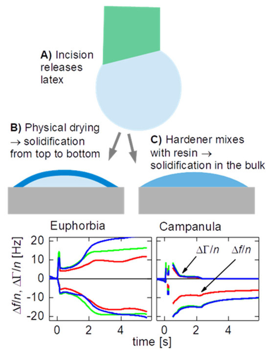 The Freiburg group undertook a third experiment [33], which motivates the work reported below. Solidification of F. benjamina and E. characias latex was monitored using nanorheometers in an initial oscillating mode followed by a stepped-shear viscosity test. Parallel measurements of the drying rate based on gravimetry allowed them to distinguish between evaporation effects in Euphorbia spp. and chemical reactions as found in F. benjamina. As with the high-pressure measurements, solidification in the case of Campanula spp. was too fast to be followed with this setup. We expand on these studies using a fast rheometer, which gives access to the drying of C. glomerata. More specifically, we employ a quartz crystal microbalance with dissipation monitoring (QCM-D, QCM, for short), which is described in Section 2 in more detail. The high data acquisition rate allows us to resolve the solidification kinetics. We further corroborate the explanation in terms of a pressure change with optical videos from plants being cut under water. These videos test whether solidification requires the presence of air.