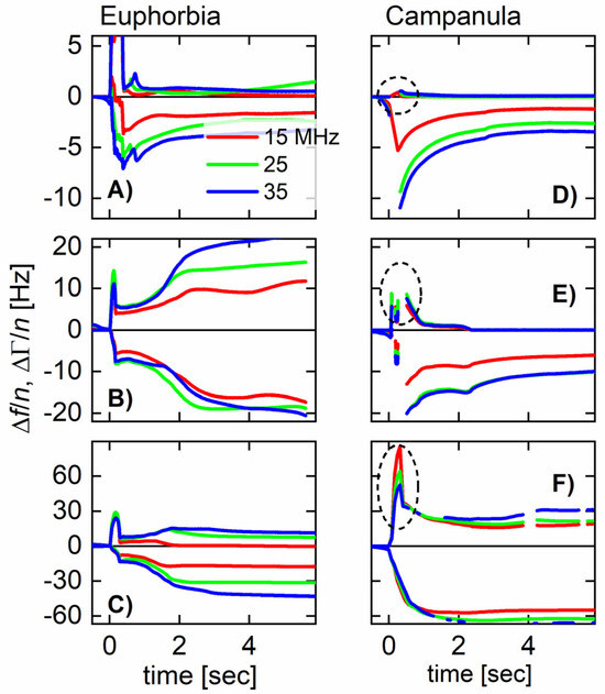 In panel F (also C. glomerata), there is a fast decrease, which, however, does not lead to zero. Judging from the frequency shift (and also from visual observation), this droplet is larger than the droplets from panels D and E. In the presence of a small viscous component of the sample’s compliance, ΔΓ increases in proportion to the cube of the sample’s thickness (Equation (44) in Ref. [37]). Because this droplet is thicker than the two others, ΔΓ/n levels off to a finite value after solidification.