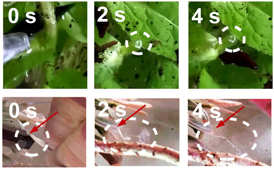 Rapid solidification in the case of C. glomerata is impressively evidenced by simply cutting the stem of the plant with a scalpel and pulling on the liquid (Figure 3). An elastic thread soon forms in the case of C. glomerata, while the thread appears much later in the case of E. characias. These experiments confirm the findings by Bold [32]. The video traces, however, are less conclusive than the QCM experiments with regard to the mechanism of solidification because what appears to be a thread might consist of a liquid cylinder surrounded by skin. This skin may form quickly because both the evaporation of water and the entry of oxygen is fast close to the surface. There is a similar experiment that avoids this ambiguity. When the incision is made under water (Figure 4), latex from C. glomerata immediately forms a plug. Clearly, neither air nor physical drying are required for solidification. Latex from E. characias, in contrast, keeps streaming away over the entire duration of the experiment, which was about one minute.