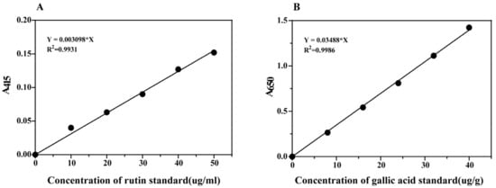 Standard curve range and R2 for rutin (A); standard curve range and R2 for gallic acid (B).