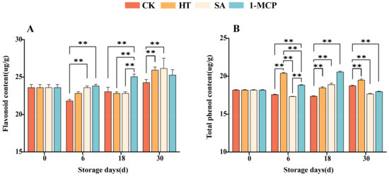 Changes in flavonoid (A) and total phenolic contents (B) of fruit pulp during storage. “**” means the result of significance analysis is highly significant (p < 0.01).